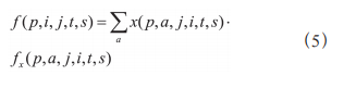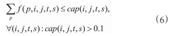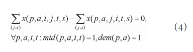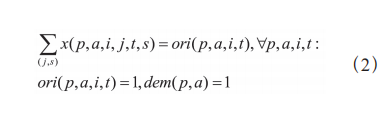 式定义了原油p 从节点 到节点 j 在时间区间 [t,s] 内 的流量 f (p,i,j,t,s) 等于所有原油在该路径上的运输选择 x (p,a,j,i,t,s) 所对应流量 fx (p,a,j,i,t,s) 之和,建立了流量与 运输路径选择之间的关系。