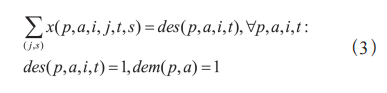 同理对于目标节点,约束(3)保证流入该节点的 所有原油运输路径数量之和等于目标节点的需求量指示值,确保需求得到满足,des 为目标节点供应指示二进制变量。