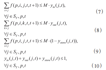 式(6)为管线能力约束,确保所有种类原油在该 路径上的总流量不超过该路径的管道能力,防止出现过 载情况,cap 为管线运输能力变量。 对于存储罐集合 ST 中的存储罐 j,式(7)表示如 果存储罐在时间 t 处于进油状态,即 yin(j,i)=0,则从其 他节点流入该存储罐的原油p 的总流量受链路容量限制; 如果不处于进油状态,即 yin(j,i)=0,由于大 M 法的作用, M 为一个很大的常数,这里取值为 1e7 ,流入流量必须 为 0。同理 yout(j,i) 收油状态变量和 ystore(j,i) 存储状态变 量也可以用式(8)、式(9)进行约束。