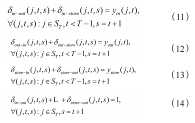 式(11)表示对于存储罐集合 ST 中满足时间先后关 系的时间点,如果存储罐在时间 t 处于进油状态,则从 进油状态转移到出油状态或存储状态的状态转移二进制 变量之和为 1 ;如果不处于进油状态,则这两个状态转 移变量都为 0,同理式(12)、式(13)分别约束出油状态和静置状态。式(14)保证在每个时间间隔内,存储 罐的状态转移情况是确定的,所有可能的状态转移二进 制变量之和为 1,表示必然发生一种状态转移。