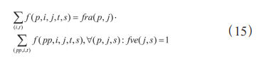 对于最终顶点(fve(j,s)=1),式(15)确保流入该节 点的每种原油p 的流量占所有原油总流量的比例等于规 定的混合比例 fra(p,j),满足目标节点的混合要求。