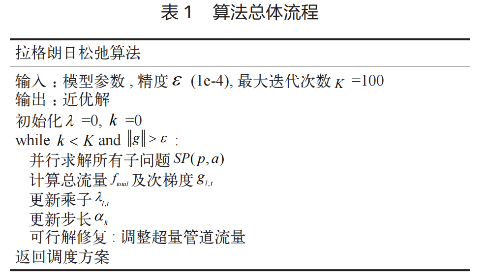 、步长 ak,自 表 1 适应衰减,平衡收敛速度与精度。如式(18)所示,次 梯度为当前子问题求解的流量与管线额定能力之差,随 迭代次数增加逐步减小,当迭代次数 k ≥ K 或相邻两次 目标函数值差值小于 ε 时,停止迭代;若存在超量管道 流量,执行可行解修复,调整超量流量至其他时段或管 道。算法总体流程见表 1。