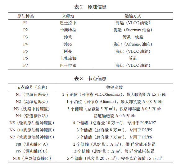 研究对象涉及 7 类原油,具体信息见表 2。案例中 节点功能与参数见表 3。以天为单位,研究周期 30 天, 覆盖一个完整的月度调度周期,海运单位成本 35 元 / t(含港杂费),管道输送成本 0.09 元 /t,铁路运输成本 0.18 元 /t,罐区状态转移成本 8 000 元 / 次 , 码头泊位单 日最大靠泊量 N1=2 艘、N2=1 艘,管道最大日输送量为 8 000 t,储罐安全库存 N5~N7 为总容量的 30%,调和罐 区 N8、N9 的原油混合比例要求 p1+p4+p7 ≥ 60%(轻质原油占比)。