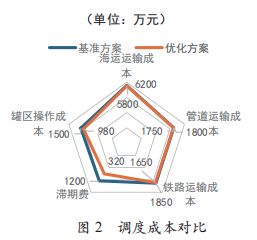 总成本优化效果如图 2 所示,与基准方案对比,优 化方案在每个成本项上都有改进,尤其是在滞期费和混 油损失上更为明显,这表明方案通过精细化的时空资源 编排,从根本上降低了受价格波动影响较大的风险成本 项。在实际运营中,若海运或管道运费发生波动,只需 在模型输入参数中更新成本系数,即可快速生成新经济 性条件下的最优调度方案,基准方案的总成本为 16 350 万元,优化方案总成本为 13 100 万元,降低了 3 250 万元, 降低比例为 19.88%。