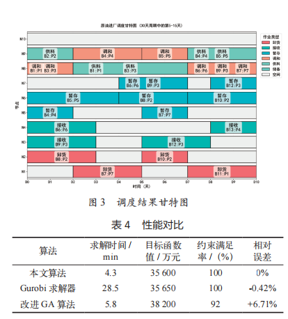 将本文所提出的时空网络模型 + 拉格朗日松弛算 法优化应用在上述案例上,分析实验结果,并将企业现 行调度方案(基于人工经验)作为基准场景,在此基础上扩展规模,原油批次从 30 批增至 80 批,测试模型扩 展性。对比本文算法与 Gurobi 求解器、改进遗传算法 (GA)的性能(求解时间、解质量)。所有实验都在以 下环境下操作:Intel Xeon Platinum 8358 处理器(32 核), 128GB 内存;Python 3.7,Gurobi 10.01,算法并行化基 于 Dask 分布式计算框架(启用 10 个工作节点)。
