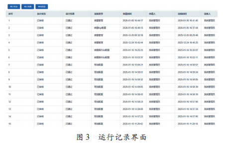 图 3 展示了 HiaPlant 工业互联网平台中规则配置及 审核流程的运行记录界面。该界面详细记录了规则配置、 规则管理、KPI 配置以及班组配置等关键管理操作的申请、 审核与生效全过程信息,包括审核状态、审核结果、审核类型、申请与审核时间以及相关操作人员等内容。通过对 规则管理流程的全过程记录,实现了设备协同控制策略从 配置到实施的规范化管理。从记录内容可以看出,平台采 用“申请—审核—生效”的闭环管理机制,确保各类控制 规则在投入运行前经过必要的审核流程,有效降低因规则 配置不当而引发运行风险。这种规则审核机制不仅提升了 协同控制策略实施的安全性和可靠性,也为装置运行管理 提供了可追溯、可审计的管理支撑,体现了精益化运行管 理对流程规范性与执行一致性的要求。