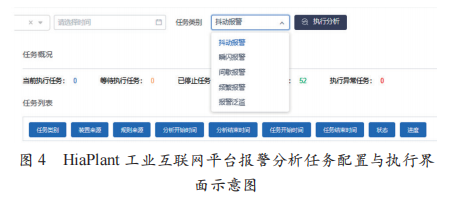 图 4 展示了 HiaPlant 工业互联网平台中报警 分析任务的配置与执行界面。平台通过对设备运行数据进 行规则化建模,将设备运行过程中的异常状态转化为可配 置的分析任务类型,包括抖动报警、瞬时报警、间歇报警、 频繁报警及报警泛滥等多种报警模式。不同类型的报警任 务对应不同的异常特征识别逻辑,用于刻画设备运行过 程中多样化的异常行为。通过对报警分析任务的分类管 理与统一执行,平台能够针对设备运行数据的波动幅度、 变化频率及持续时间等特征进行综合分析,实现对异常状 态的分级识别与精准响应。该机制有效避免了单一阈值报 警导致的误报或漏报问题,提高了异常识别的准确性和实 用性,为设备协同控制和精益化运行管理提供了重要的技术支撑。