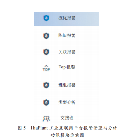 图 5 展示了 HiaPlant 工业互联网平台中报警管理与分 析相关的功能模块构成。平台围绕设备运行异常的识别、 分类与处置需求,构建了多层级报警管理体系,包括溢流 报警、陈旧报警、关联报警、Top 报警、班组报警以及类 型分析等功能模块。各模块从不同管理维度对设备运行报 警信息进行组织和分析,实现对异常事件的多角度刻画。 通过对报警信息的分层分类管理,平台能够有效识别高 频报警、长期未处理报警以及具有关联特征的复合报警事件,避免报警信息冗余对运行人员决策造成干扰。结合班 组管理与交接班功能,实现报警信息在运行管理层面的有 效传递与责任划分。该报警管理体系提升了异常事件处置 的针对性和效率,为石化装置精益化运行管理和协同控制 策略的持续优化提供了有力支撑。